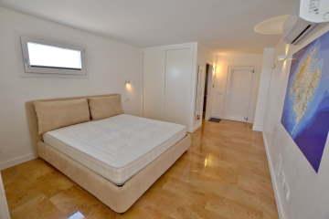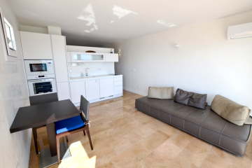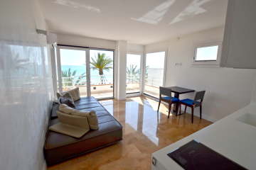 Apartamento moderno con vistas de ensueño en 1ª línea de mar en la Playa de Palma € 495.000 Este coqueto piso se encuentra en un pequeño edificio con sólo 10 unidades directamente frente a la playa. Ha sido reformado y amueblado de alta calidad y tiene una superficie construida de 70 m². Los antiguos 3 pequeños dormitorios y el baño pequeño se han transformado en un amplio dormitorio y un espacioso y moderno baño con ducha. Desde el salón-comedor con una cocina moderna integrada y desde el balcón se tiene una inmejorable vista al mar y a toda la bahía de Palma. En el precio se incluye un trastero independiente para las bicicletas, etc.